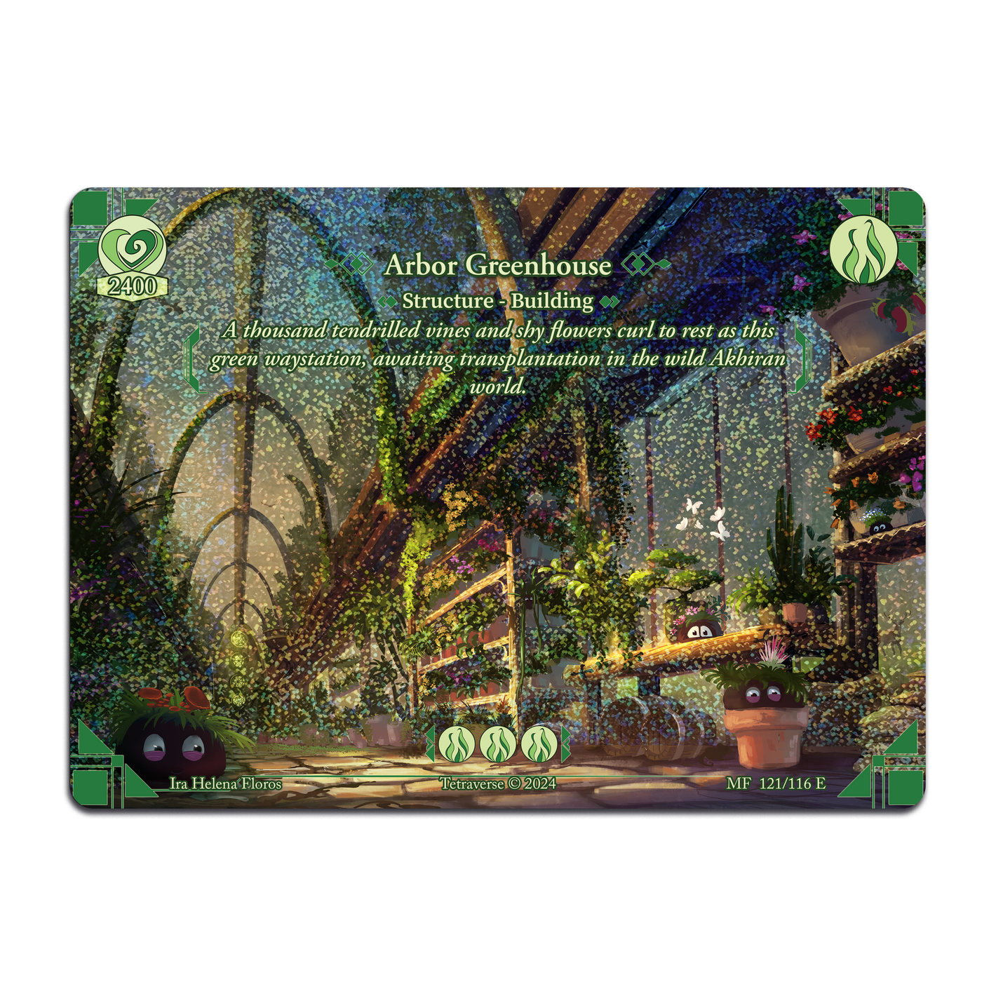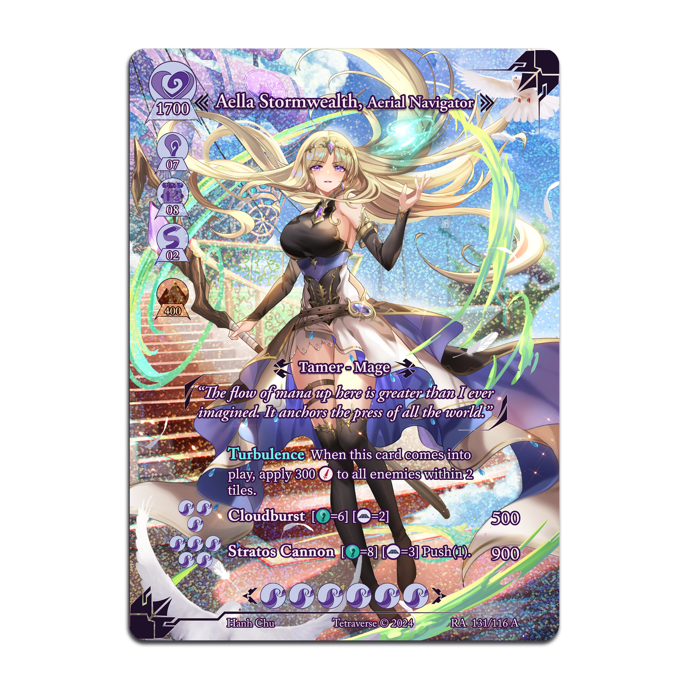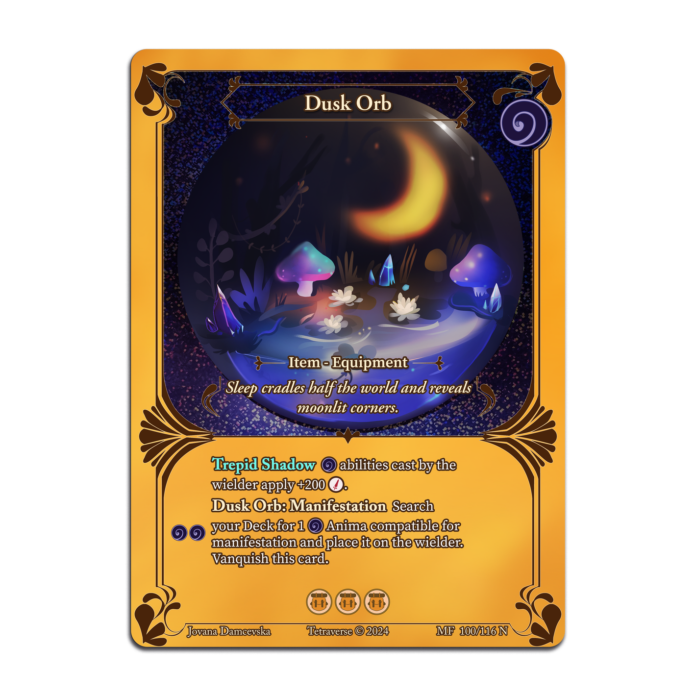 Tetraverse TCG is a board game. Cards are placed strategically into play. Players place equippable Tamers and Animas, upgradable Structures, mana-generating Landscapes, and Event cards to control the playing field.